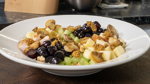 Хотите удивить себя и родных новеньким вкусом? Ловите рецепт обалденного салата! Салат Вальдорф - идеально подходит как для праздничного стола, так и для лёгкого запоминающегося ужина: готовится за 15 минут, выглядит изысканно и, уверен - понравится всем без исключения. Яблоко очищаем от кожицы, нарезаем небольшими кубиками и отправляем в миску с холодной водой, подслащенную сахаром. Грибы разрезаем вдоль на две части и обжариваем до румянца на растительном масле. Для более яркого вкуса, рекомендую при жарке грибов добавить один зубчик чеснока...