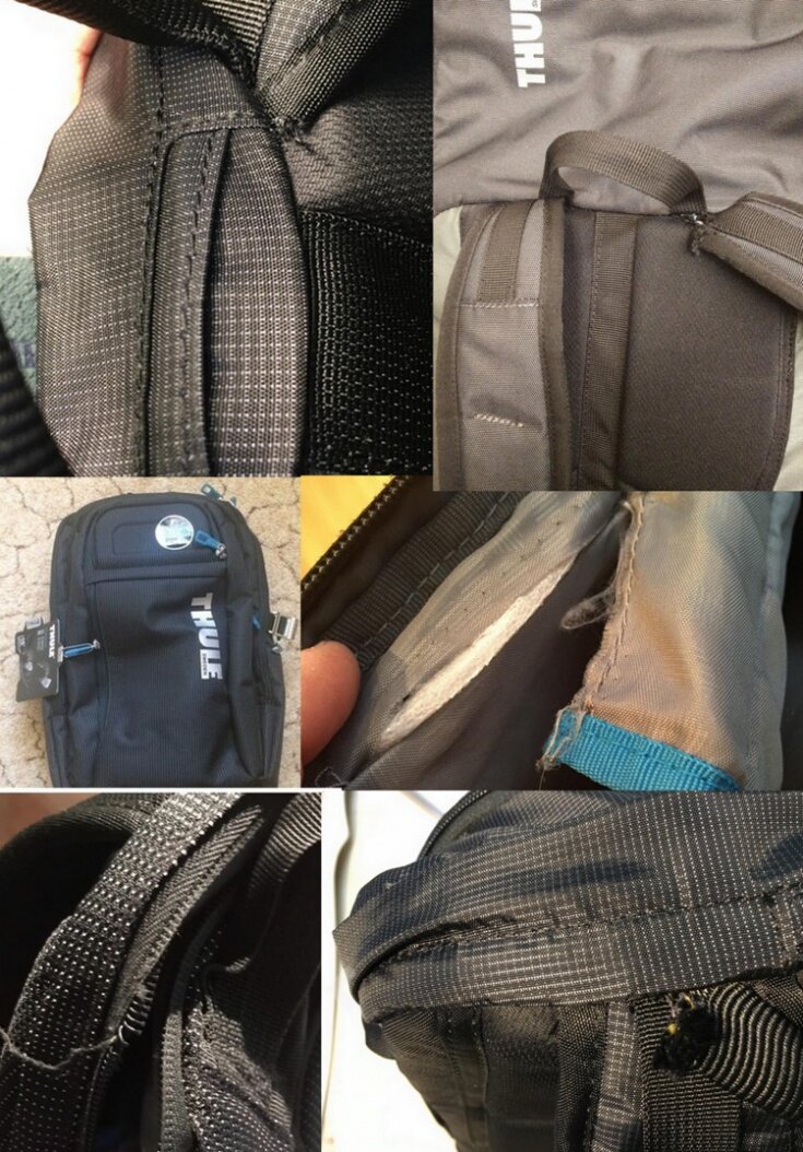 2. Видела рюкзак THULE купленный на Амазоне, качество в разы лучше (цена в три раза меньше). Ткань похожа, но не так мнется, плотнее. И разводов не остается. Швы внутри аккуратнее сделаны. У моего рюкзака Туле за неделю пополз шов притачивания спинки к подкладке и оттуда вылез какой-то уплотнитель, все засоряющий своими ошметками. Спереди тоже. А на Амазоне этот узел принципиально иначе сделан. Совпадение? Не думаю! Правда, лямки так же режут плечи. Зато цена на мой Thule Crossover в три раза меньше! Фото брака в посте тоже все с Амазона. Это не только моя отдельная проблема. Мои товары thule быстро отправились на свалку, но, разумеется, найти фото отзывы с такими же дефектами для этого отзыва было несложно — как бы они не старались подкупить блогеров, люди, потратившие свои деньги, отзывы пишут честно! AMAZON, крупнейший магазин в мире, оказался заполнен фото доказательствами отвратительного качества продукции: