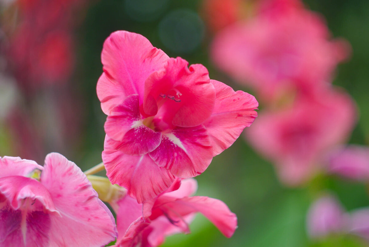Гладиолус или шпажник - популярный садовый цветок, многолетний представитель семейства ирисовых. Второе название растение получило из-за сходства со шпагой. На данный момент выведено много сортов, среди которых можно найти свой оптимальный вариант. Шпажник может быть окрашен в совершенно разнообразные цвета: красный, желтый, персиковый, фиолетовый, голубой, розовый. Вот о последнем мы и поговорим. Розовый цвет - это оттенок любви и нежности, а розовые гладиолусы - это настоящая сказка в вашем саду. Цветы нежнейшего оттенка подарят цветоводу яркие, незабываемые эмоции и хорошее, романтичное настроение. Изящные лепестки похожи на подол бального или свадебного платья. Цветок очень интересен неравномерной окраской: переходы от бледно-розового к насыщенному оттенку, молочно-белые вкрапления. Очень часто гладиолусы используют в цветочных композициях. Получаются невероятные букеты! Но все же в саду шпажник выглядит куда прекраснее - изящный, роскошный, аристократичный. Он украсит абсолют