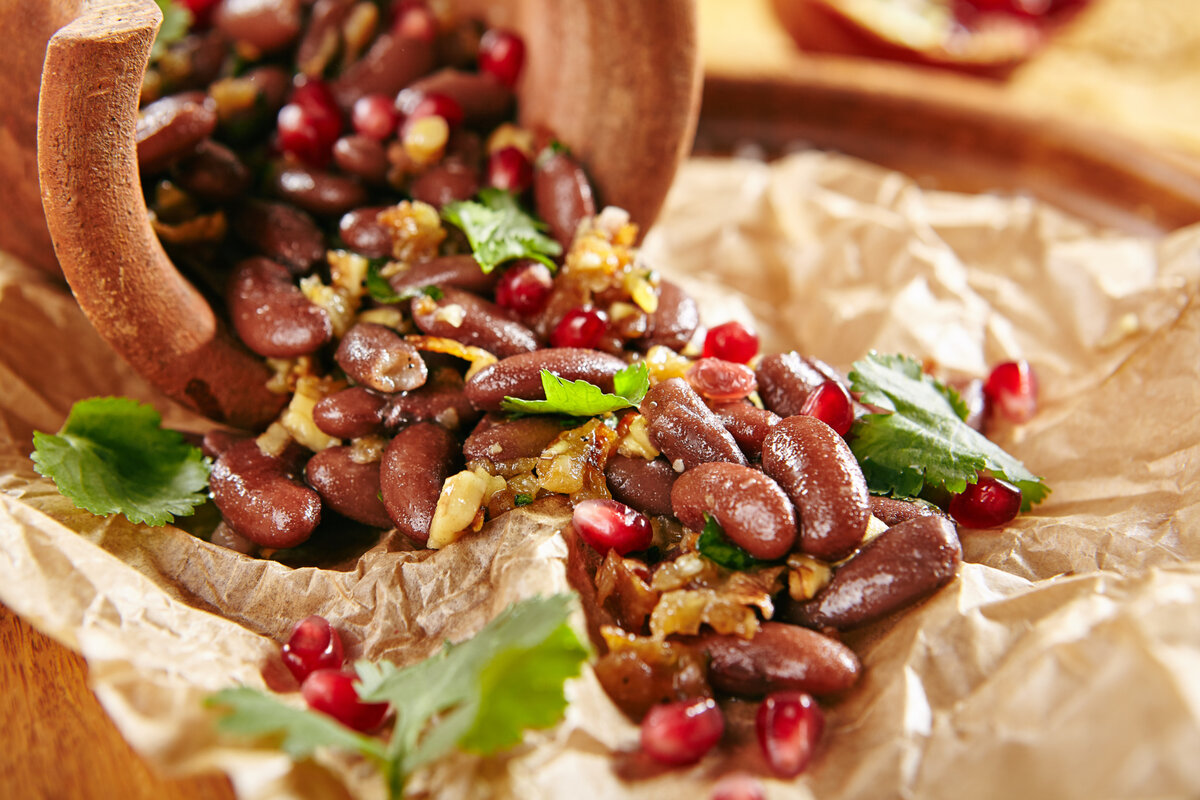 1️⃣ Чеснок очистить, разрезать вдоль на 2 части, измельчить, лук нарезать мелкими кубиками, перец чили — тонкими кольцами. 2️⃣ Соединить все с растительным маслом, добавить консервированную фасоль, крупно нарезанную зелень, перец и дробленые орехи. 3️⃣ Подавать к столу в качестве закуски или дополнительного гарнира к дичи или птице вместе с листьями шпината или салата.