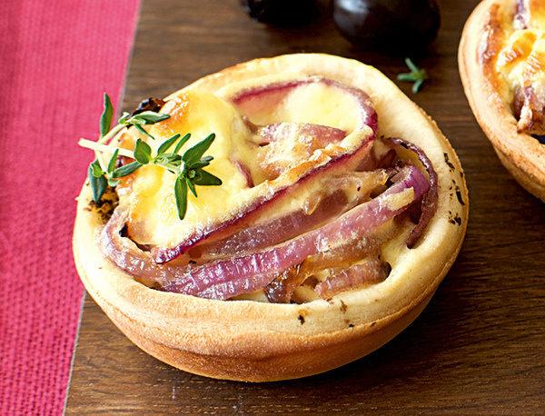 Ингредиенты 450 г дрожжевого теста 3 красные луковицы (около 400 г) 50 г бекона 1 ст. нейтрального растительного масла 3 ветви тимьяна Соль Перец 150 г сметаны 75 г свежего козьего сыра 1 яйцо 3 ст.ложки тапенады можно любой соус по вкусу Мука для рабочей поверхности Способ приготовления Разморозьте дрожжевое тесто. Очистить лук и нарезать кольцами. Мелко нарезать бекон. Разогреть масло и бекон на сковороде, добавить лук и на среднем огне 4-5 мин. обжарить, помешивая. Вымойте тимьян и встряхните, снимите листочки и добавьте. Приправить солью и перцем. Дайте смеси остыть. Разогреть духовку до 200°. Дрожжевое тесто раскатайте на посыпанной мукой рабочей поверхности. Вырежьте 12 кругов диаметром 9 см, вдавите тесто в формочки и несколько раз проколите вилкой. Накрыть и 10 мин. оставьте в теплом месте. Между тем, сметану смешать с козьим свежим сыром и яйцом. Каждый кусочек теста намазать соусом тапенада. Добавьте лук-бекон и залейте смесью свежего козьего сыра. В Духовке (Середина, Ре