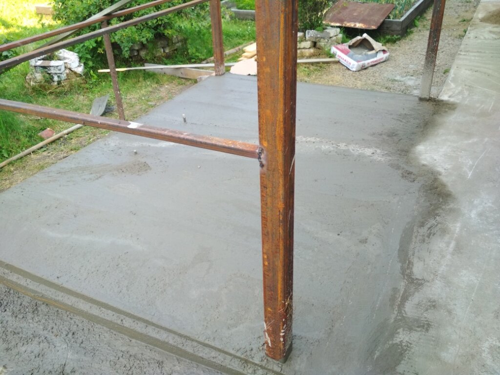 Все началось с разметки. Решил сделать сбоку у дома. С размерами определился - 3х3, чтобы ни много и ни мало. Проверил диагонали и начал копать ямы под столбики. Грунт у нас хороший, не пучистый, в основном камень или скала, поэтому глубиной залегания можно пренебречь. Ямы было выкопаны на глубину 40-50 см. Установлено 4 квадрата 80х80 и залито бетоном.