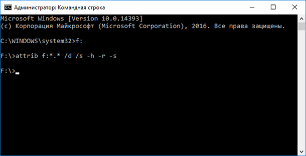 - Введите команду: attrib f:*.* /d /s -h -r –s и нажмите Enter: