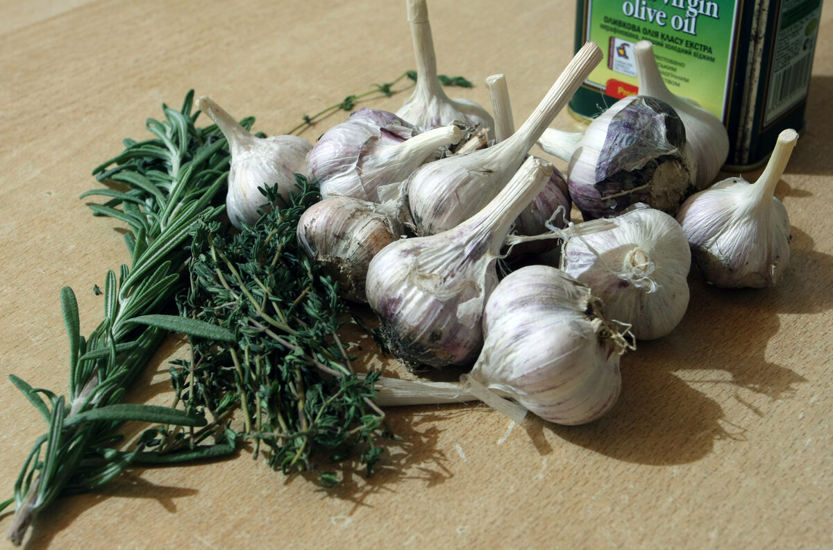 Я готовил материал про чеснок, какой он бывает, где растет и прочее. Неожиданно наткнулся на книгу Ален Дюкасс, где увидел сначала название блюда, а потом решил приготовить по его рецепту указанное блюдо. Долго я не решался сделать «это нечто» из чеснока. Не было уверенности, что ЭТО можно вообще есть. В итоге я приготовил вкуснейшую закуску. Видимо очень мало, т.к. жена «приговорила» готовое блюдо за один присест. Насколько это вредно, не сужу. Но точно, даже съеденное количество чеснока, который был приведен в состояние вкуснейшего блюда, никак не повлияло на ее гастрит и я, честно, не ощущал никаких неприятных запахов, чем славится сырой чеснок. Да, кстати, если вы решили съесть сырой чеснок, но впереди еще встречи и желудок слаб, то удалите сердцевину зубчика, именно из-за него всё зло. В рецепте «участвует» чеснок целиком, без удаления и прочего, что лишний раз доказывает, чем проще блюдо, тем оно вкуснее. Ингредиенты: На 200 гр. (стакан). 3 головки чеснока, Тимьян, Розмарин, Сол