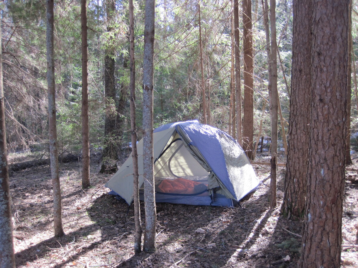 Поставил себе домик в уютном месте.Люблю стоять в ельнике,очень удобно по трём причинам: -Всегда есть дрова,даже в дождь,а многочисленные нижние ветки ели сухие и ими удобно разжигать костёр. -Очень вкусный воздух,пахнет смолой и хвоей,особенно на солнце когда пригреет. -Незаметность.С воды и на берегу почти не видно,густой хвойный лес надёжно укрывает,можно проплыть мимо и не заметить.К примеру утки весь день резвились рядом на реке и меня совсем не замечали,хотя до уреза воды было всего 10-12 метров Вид на реку со стоянки __________________________________________________________________________________________ На следующий день приплыли друзья Первый показался Миша,он знает что я приехал сюда на речку. А Илья и Юра ещё не знают что я буду здесь.. небольшой сюрприз.. Небольшой отдых после ночного поезда.Юра спит. А я стараясь не мешать и не шуметь. Пошёл побродить пока по лесу Вчерашняя попытка добыть рыбы провалилась.Не поймал ничего. А так хотелось накормить друзей утренней ухой.