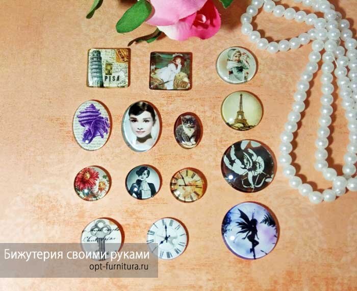 Стеклянные кабошоны получили распространение несколько лет назад. Это небольшие стеклянные заготовки различной формы (круг, овал, квадрат и пр.), которые в бижутерии используются при декорировании основ для колец, серег, брошей, кулонов и т.д.. Например, сделать кулон с чьим-то фото возможно как раз с помощью такого кабошона и фотодекора. Что есть фотодекор? Это распечатанные изображения, которые подбираются для приклеивания к кабошонам. Распечатать вы можете их как дома, так и в печатной мастерской. Качество и формат бумаги зависит от того, каким именно видом клея вы будете пользоваться. На основе этого мы разделили способы работы с кабошонами на 2 варианта. Итак, давайте перейдем непосредственно к процессу. 1 Вариант. Приклеиваем стеклянные кабошоны с помощью фото-клея (УФ клей). ВНИМАНИЕ! При работе с данным клеем изображение необходимо распечатывать только на фотобумаге. Капните несколько капель на изображение и положите сверху кабошон. Затем пальцем придавите кабошон сверху и поде