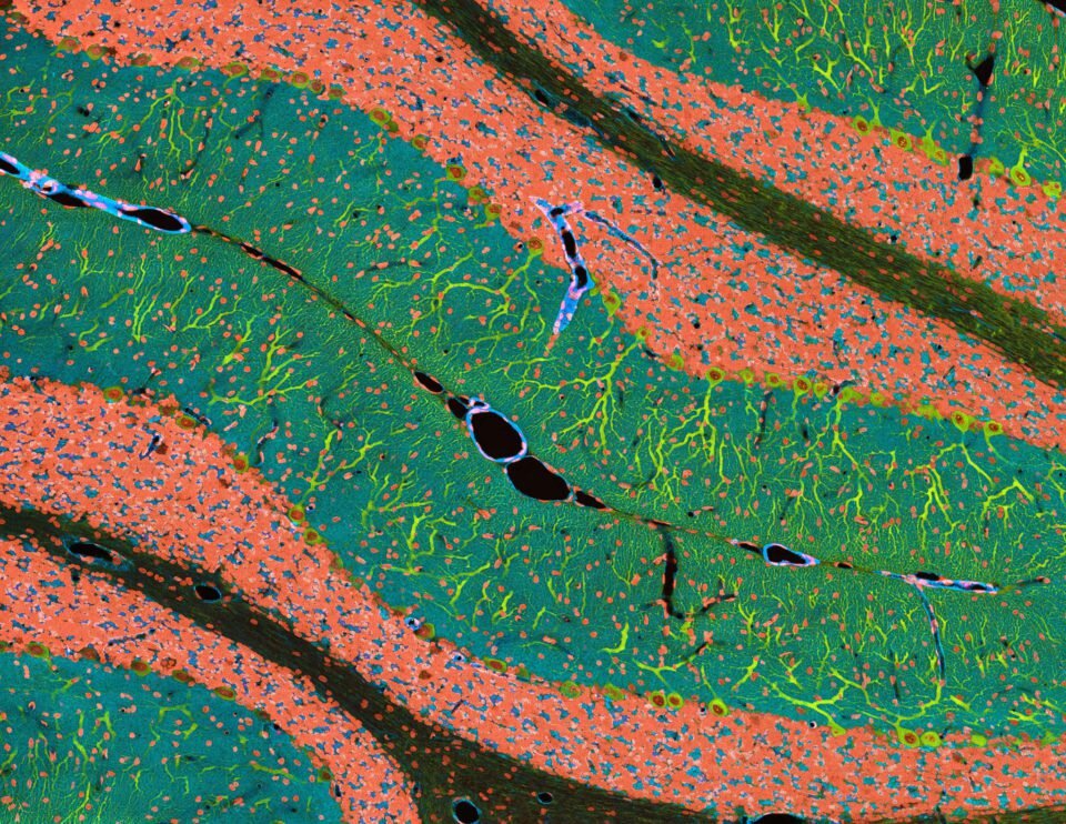 Сегодня у нас все просто: обыкновенный мозжечок крысы. Но он всегда красив, как не прокрашивай гистологический препарат. И всегда будут красивы огромные «деревья» клеток Пуркинье, самые большие и «развесистые» нейронные деревья. Неудивительно, что некоторые их этих клеток могут иметь 100-150 тысяч синаптических входов! Credit: Thomas J. Deerinck