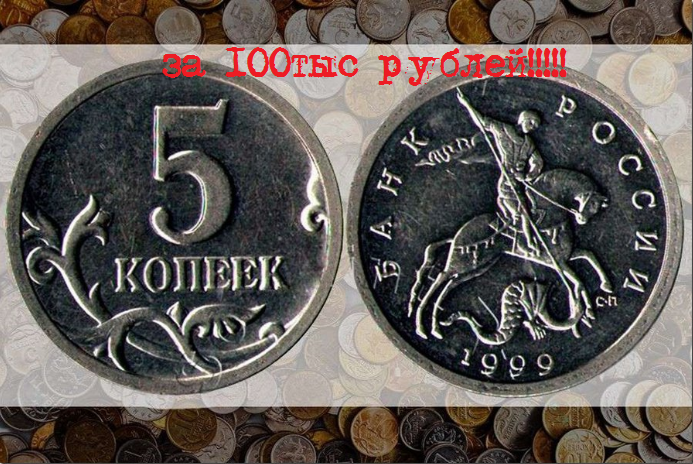 Здравствуй, дорогой друг :) Не против если перейдем на "ты" ?) Сегодня расскажу тебе кратко о монете 5 копеек 1999 года. Это очень редкая монета , которая по нынешним ценам оценивается в 100 тыс рублей!! Прикинь? Поговаривают, что их выпустили в штучном тираже. Ну а вдруг у тебя именно такая монета?? Тогда тебя поздравляю :) Ниже будет фото как выглядит такая монета. Не забудь оставить лайк и подписаться, чтобы не пропустить другие познавательные статьи на тему денег и не только :)