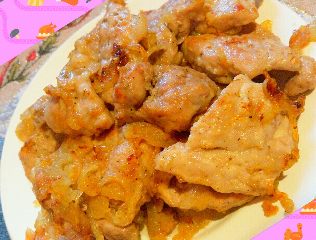 Если вы задумываетесь над тем, как именно приготовить сегодня мясо - попробуйте сделать отбивные, маринованные с луком. Просто, быстро и, конечно же, очень вкусно. Итак, филе свинины нарезаем на плоские кусочки толщиной около сантиметра. Размер в диаметре значения не имеет - мне нравятся небольшие кусочки, кто-то, напротив, предпочитает порции побольше. Пару больших или три средние луковицы нарезаем полукольцами. Мясо раскладываем на разделочной доске, накрываем пакетом или пищевой плёнкой и хорошенько отбиваем с обеих сторон. Мясо солим и перчим по вкусу. В миску выкладываем слой лука, слой отбивных, слой лука, слой отбивных, завершаем импровизированную слоенку луком. Оставляем мариноваться на часок-другой при комнатной температуре. Затем разогреваем в сковороде растительное масло и обжариваем все отбивные на сильном огне с двух сторон до зарумянивания. Без лука. Лук отправляем к отбивным только после их поджарки. Убавляем огонь до чуть ниже среднего и жарим-тушим до полной г