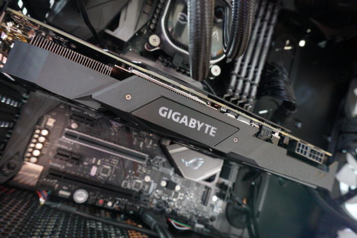 Под кожухом располагается полноразмерный радиатор, где есть пара медных тепловых трубок. Они контактируют с графическим процессором для лучшего рассеивания тепла. Ниже лежит металлическая плата, которая отводит тепло от чипов памяти и транзисторов. Ещё есть металлическая задняя пластина с логотипом производителя. Другой логотип Gigabyte вы найдёте на краю платы, он состоит из светодиодных индикаторов и может настраиваться.