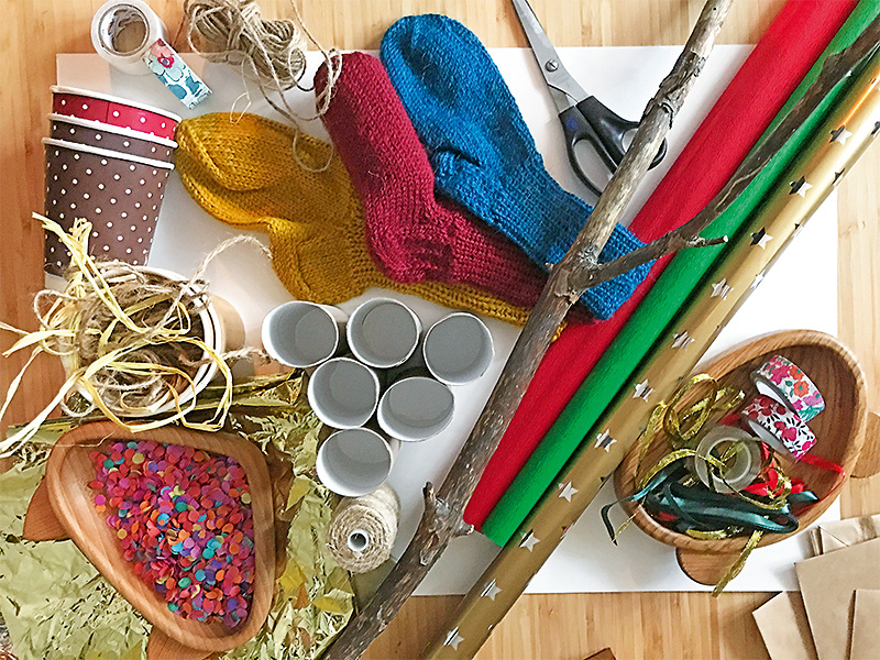 В каждом кармашке адвент-календаря чудо: открываешь, находишь сюрприз, и праздник становится ближе на день. Мы подготовили для вас простой и быстрый в исполнении вариант счастливого календаря. ВАМ ПОТРЕБУЕТСЯ: Длинная сухая ветка/палка, моток пеньковой веревки и любые праздничные ленты, 5 вязаных носков, 3 конверта 10/15 см и 3 конверта 15/21 см, 5 бумажных стаканов из-под кофе/чая,11 втулок от туалетной бумаги, 4 бумажных пакета для сэндвичей, ножницы, клей, скотч. ПОДГОТОВЬТЕ: Нарисуйте от руки, напечатайте штампами или купите готовые шаблоны цифр от единицы до тридцати одного. Их мы будем наклеевать на каждый из элементов календаря. КАК СДЕЛАТЬ: 1. Из картонных втулок мы делаем коробочки и «хлопушки». Сложите втулку пополам вдоль и с каждой стороны загните края трубочки: получатся симпатичные коробочки. Украсьте их лентами или бумажным скотчем. Заверните втулку в лист золотой бумаги, завязав с одного конца ленточкой: второй конец завяжете, положив в «хлопушку» подарок. 2. Конверты,
