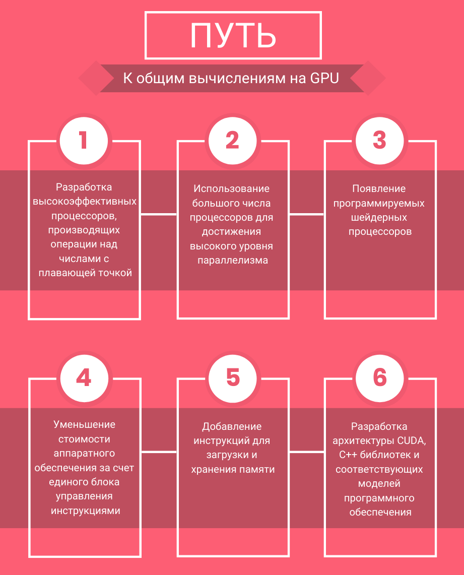 В 2006 году NVIDIA объявила о выпуске линейки продуктов GeForce 8 series, которая положила начало новому классу устройств, предназначенных для общих вычислений на графических процессорах (GPGPU). В ходе разработки NVIDIA пришла к пониманию, что большее число ядер, работающих на меньшей частоте, более эффективны для параллельных нагрузок, чем малое число более производительных ядер. Видеопроцессоры нового поколения обеспечили поддержку параллельных вычислений не только для обработки видеопотоков, но также для проблем, связанных с машинным обучением, линейной алгеброй, статистикой и другими научными или коммерческими задачами.