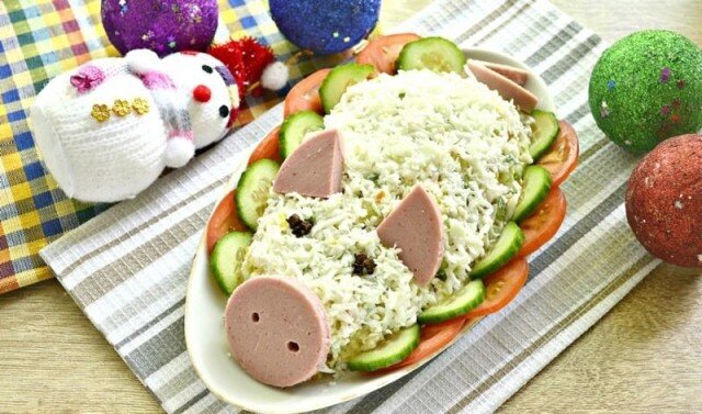 4. Теперь соберите салат. Первый слой огурцы, затем рыба. Далее обильно рыбу смажьте сыром. А вот сверху выложите остывший рис, придавая закуске форму поросенка. Вырежьте из ломтиков колбасы уши, пятачок и хвост. Сделайте мордочку и вставьте хвостик, а глаза сформируйте из половинок маслин.