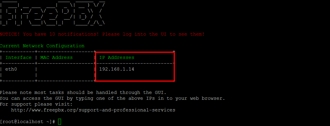 Чтобы подключиться к графическому интерфейсу FreePBX, нужно ввести IP – адрес Asterisk, который вы указали на этапе установки. Если вы забыли, какой IP – адрес указали, то подключите монитор и клавиатуру к вашему серверу, а затем введите данные для пользователя root, как показано ниже: