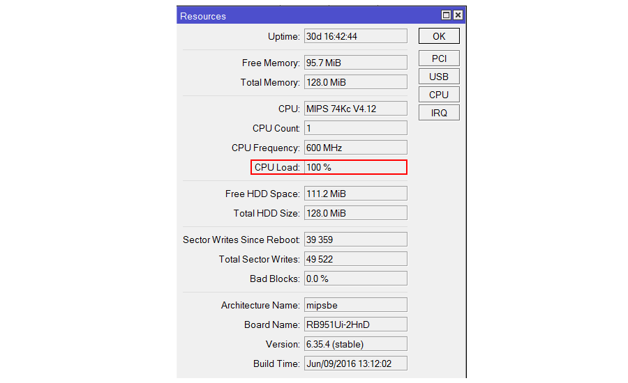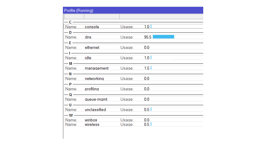 Сетевое оборудование вендора Mikrotik является весьма любопытным и привлекательным продуктом в сегменте SOHO (Small office/home office). Соотношение цены, качества, функционала и стабильности обеспечивает все большее распространение небольших белых коробочек в офисах небольших компаний. Но спустя какое-то время беззаботного пользования, пользователи начинают жаловаться. Администратор, открыв Winbox, переходит в раздел System → Resources и видит, что загрузка процессора 100%: Не стоит волноваться. У нас есть решение. Все настройки и «траблшутинг» будем осуществлять с помощью Winbox. НАСТРОЙКА FIREWALL В MIKROTIK Первым делом давайте проверим службу, которая больше всего «отъедает» ресурсов процессор. Для этого, перейдем в раздел Tools → Profile: Как видно из скриншота, львиную долю ресурсов нашего процессора занимает служба DNS. Давайте посмотрим, что происходит на уровне обмена пакетами на основном интерфейс ether1. Для этого воспользуемся утилитой Tools → Torch: Мы видим большое колич
