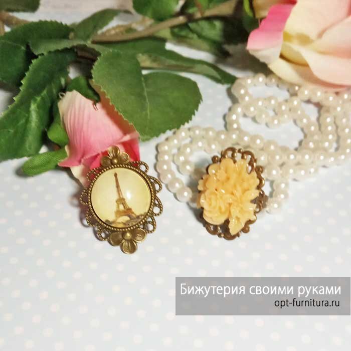 В данном материале мы продолжим рассматривать с вами азы создания бижутерии своими руками. На этот раз, остановимся на самом простом варианте создания колец, который не вызовет у вас никаких трудностей. Всё, что нам понадобится, это: - основы для колец - декор или кабошоны - универсальный клей Материалы вы с легкостью сможете приобрести в любом магазине по продаже фурнитуры для бижутерии или товаров для рукоделия. Основы для колец могут быть с фигурной или филигранной площадкой, либо с сеттингом. Сеттинг – это специальная рамка, которая удерживает декор, той или иной формы. Давайте, для начала, рассмотрим пример создания кольца, используя разные виды основ и акриловый декор (цветочные кабошоны, камеи и т.д.). На фото представлен примерный набор выбранных материалов, который мы можем использовать. Далее, просто берем универсальный клей и приклеиваем декор к основе. Место склеивания можно немного зачистить мелкой наждачкой и обезжирить, это обеспечит лучшее сцепление. Для второго пример