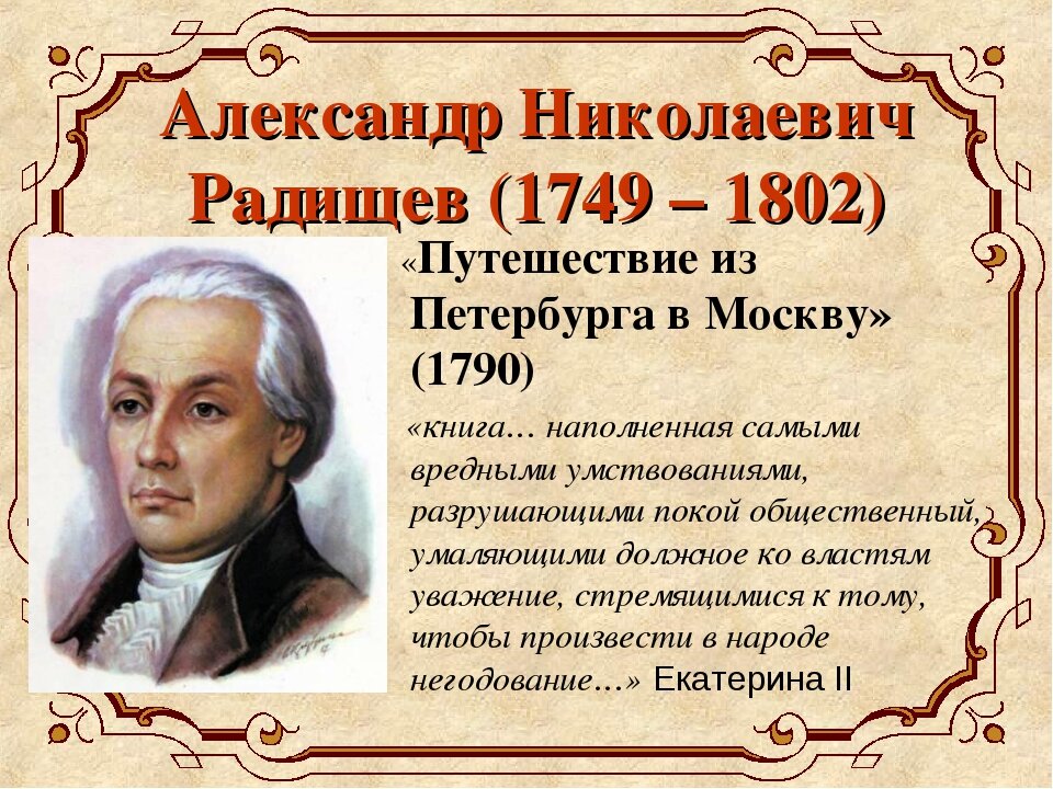 История Александра Николаевича Радищева. Речь пойдет о великом поэте, творчество которого известно на весь мир. И не мало желающих узнать, за что же он был сослан в Сибирь, почему его жизнь была такой тяжелой. Об этом я вам сейчас и расскажу. Александр Николаевич Радищев родился 20 (31) августа 1749 года в Москве в дворянской семье. Детство будущего писателя прошло в селе Немцово, затем его семья переехала в село Верхнее Аблязово. Начальное образование Александр Николаевич получил дома. В 1756 году отец отвез Радищева в Москву. Мальчика поселили у А. Аргамакова, который в то время служил директором Московского университета. Обучением Радищева там занимался специально нанятый француз-гувернер.