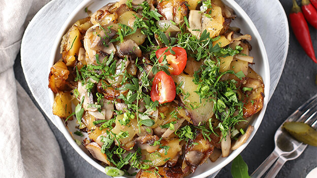 Самвел Агаджанов, повар горячего цеха, ресторан «Барин» Ингредиенты на 1 порции Пошаговый рецепт Лучше взять сковороду с большой площадью жарки. Если жарить большой объем картофеля на маленькой сковороде, картофель не пожарится, а потушится, и вкус будет отличаться от традиционного. Очистите и нарежьте картофель дольками. Мы нарезали картофель толщиной примерно 3-4 мм. На раскаленную сковороду вылейте растительное масло для жарки, разогрейте масло в течение 5-7 секунд и добавьте нарезанный картофель. Жарьте на среднем огне 10 минут, аккуратно помешивая. Пока картофель жарится, нарежьте грибы дольками такой же толщины, как и картофель. Очистите и нарежьте лук полукольцами. Добавьте лук и грибы и жарьте еще 5 минут. Если добавить лук и грибы в начале вместе с картофелем, лук с