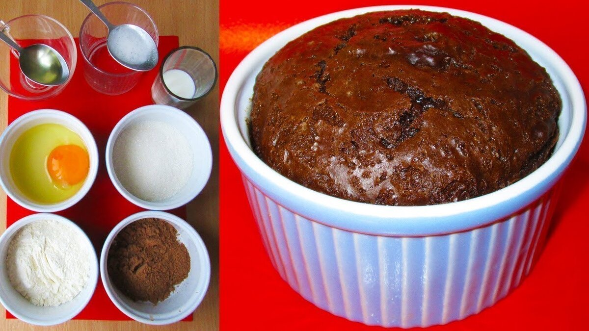В чашке смешайте при помощи вилки или венчика яйцо с сахаром. Потом добавьте какао. Муку и крахмал (если его нет, то можете просто добавить 4 ст. л. муки), а так же разрыхлитель, хорошо перемешайте. После этого добавьте растительное масло и молоко. Всё это хорошо размешайте до получения жидкой однородной массы. Тесто вылейте в чашку (миску), объёмом не меньше 500 мл, предварительно застелив на дно пергамент. Поставьте в мик