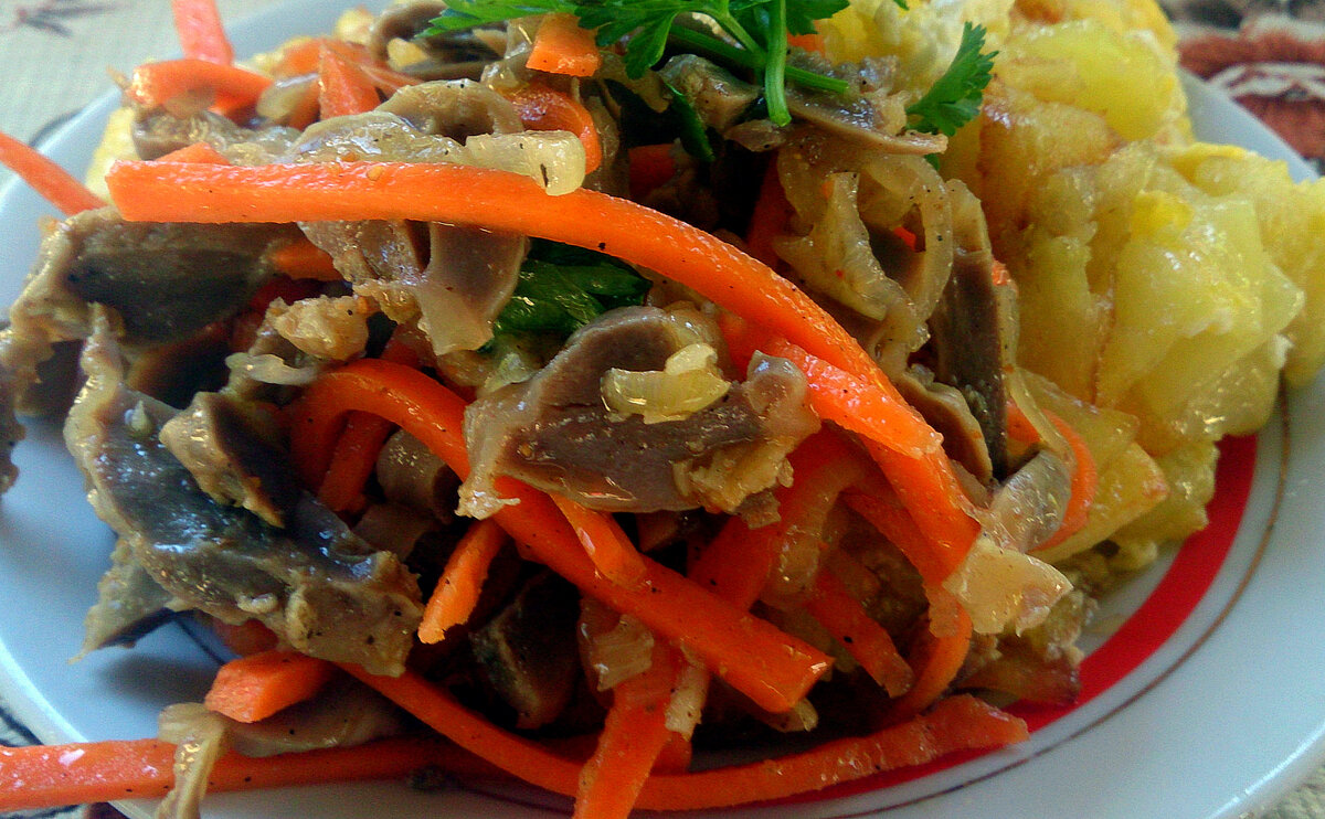 Ингредиенты:куриные желудки - 500 гр;лук репчатый - 2 шт;морковь - 1 шт;чеснок - 2 зубчика;соевый соус - 2 ст. л.;масло растительное - 2 ст. л.;уксус 9% - 1,5 ст. л.;соль - по вкусу;перец черный молотый - по вкусу;приправа для корейской моркови - 1 ч. л.