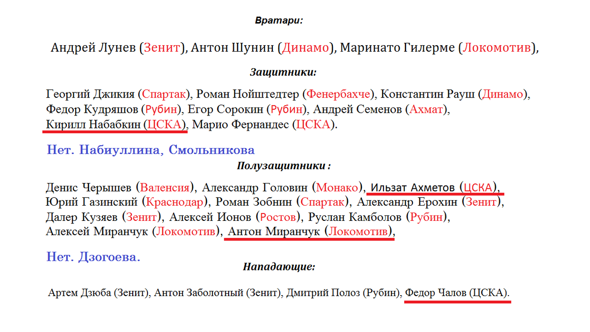 Привет всем, как вы поняли из названия поговорим про изменения в составе сборной, и узнаем кто сыграет в ноябрьских играх со Швецией и Германией. Вызваны на эти игры 3 вратаря: Андрей Лунев (Зенит, Санкт-Петербург), Антон Шунин (Динамо, Москва), и проявивший себе не плохо в октябре за сборную Маринато Гилерме (Локомотив, Москва), и он со Швецией и Турцией не пропустил ни одного гола. Как и в прошлый раз, в составе вратарей изменений нет. В начале октября Акинфеев, объявил и завершил выступления за сборную. Переходим к защитникам, их 8 мь, итак это: Георгий Джикия (Спартак, Москва), Роман Нойштедтер (Фенербахче, Турция), Константин Рауш (Динамо, Москва), Федор Кудряшов (Рубин, Казань), Егор Сорокин (Рубин, Казань), Андрей Семенов (Ахмат, Грозный), Кирилл Набабкин (ЦСКА, Москва), Марио Фернандес (ЦСКА, Москва). И тут есть изменения. Не вызван на этот раз Эльмир Набиуллин и Игорь Смольников из Зенита. Но появился защитник ЦСКА Кирилл Набабкин. Полузащитники их 11ть: Денис Черышев (Ва