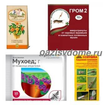 1. Гром 2 и Мухоед. Препаратами в виде порошка или гранул очень удобно пользоваться. Достаточно просто насыпать на верхний слой почвы написанное в инструкции количество порошка и немного полить землю. Гранулы будут растворяться и пагубно влиять на вредителей. При необходимости процедуру повторяют через несколько дней, но, обычно, хватает и одного использования препарата «Мухоед» или «Гром 2».