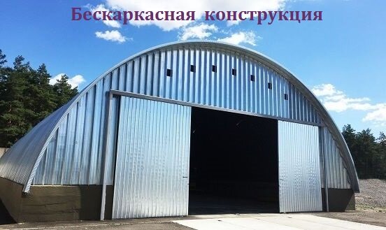 - Бескаркасная. Это арочная водонепроницаемая конструкция, в которой отсутствует каркас. Его роль выполняют арочные стены ангара. Дополнительное устройство кровли не требуется.