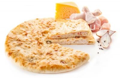 Для приготовления начинки жирное куриное мясо первого сорта необходимо зачистить от сухожилий, пленок и нарубить очень мелко (или пропустить через крупную решетку мясорубки). Добавить в мясо сыр, нарезанные грибы, мелко нарезанный репчатый лук, чеснок растертый с солью, молотый черный перец, немного красного горького перца, соль, влить бульон или воду из расчета 30% к весу мяса. Получившуюся начинку хорошо смешать. Затем равномерно разложить начинку на тесте.