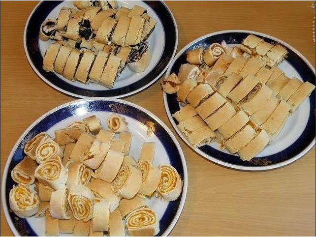 Ингредиенты: 1 стакан сметаны; 2/3 стакана сахара; 1 яйцо; 0.5 ч. ложки соды (погасить); 3 стакана муки. Начинка: 100 гр. чернослива; 150 гр. кураги; 100 гр. орехов; 150 гр. изюма. Крем: 750 мл сметаны; 1 ст. сахара; Приготовление: Начинку для торта можно приготовить заранее: залить сухофрукты горячей водой и распарить их. Затем перекрутить орехи и сухофрукты на мясорубке по отдельности. Я перекручивала на комбайне, так быстрее. Если фруктовые смеси получились густыми, можно добавить горячей воды, хорошо размешать и сделать как повидло. Я перемешала орехи с черносливом. Для теста: перемешиваем яйцо с сахаром и сметаной, добавляем соду и муку. Тесто должно получится мягкое, но не прилипать к рукам. Делим тесто на 8 колобков. Из каждого колобка раскатываем лепешку, намазываем ее черносливом и делаем рулет. С черносливом 2 рулетика, а с курагой и изюмом по 3. Печем рулетики при 180 градусах до золотистого цвета. Остужаем и разрезаем на кусочки. Взбиваем с