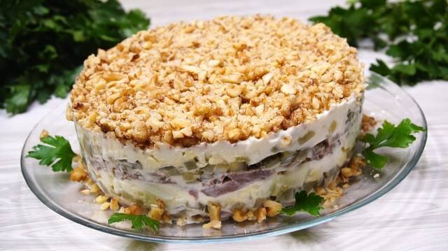 Первым слоем кладем половину мяса, хорошо смазываем майонезом. Вторым слоем кладем половину нарезанных огурцов с чесноком. Смазываем майонезом. Третьим слоем кладем половину яиц и смазываем майонезом. Теперь повторяем слои, вторая половина мяса, вторая половина огурцов, оставшиеся яйца. Грецкие орехи 100 гр слегка измельчим блендером или нарубим ножом. И кладем сверху на са