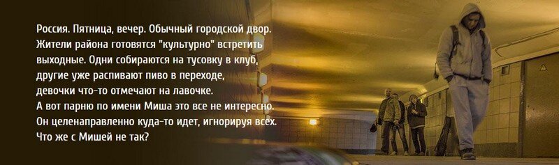 Выходя из супермаркета, главный герой встречает, то просящих купить им пиво малолеток, то спивающегося одноклассника, который искренне не понимает, почему тот отказывается с ним выпить, то соседских девушек, своим поведением больше напоминающих проституток, то наркодиллера, активно пытающегося продать ему что-то из своей дряни, то знакомых, которые зовут его в клуб, подкрепляя своё предложение убийственным для адекватного человека аргументом: «Какие могут быть планы в пятницу вечером, кроме клубов и тёлок»? Главный герой идёт по улицам города и вокруг видит только спивающуюся молодёжь, которой кроме стакана в этой жизни не интересно уже ничего. В этом обществе он – чужой, он – изгой, он – белая ворона. Среди чёрных, видимо.
