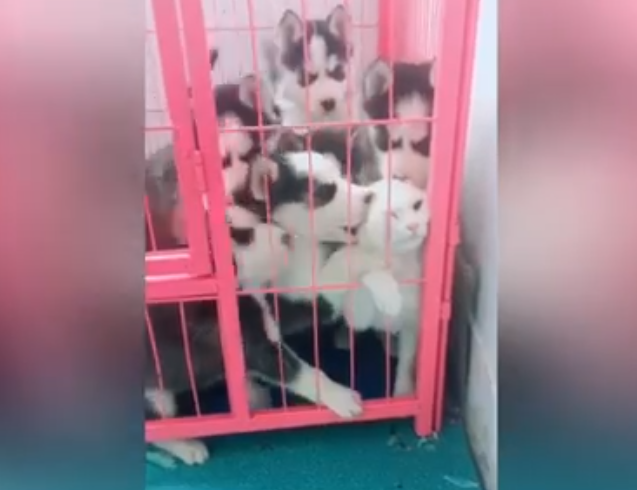 Очень любвеобильные собачки встретили кошку со всей любовью. Со слов хозяина когда гостья попала в клетку она была атакована щенками, но не со злыми намерениями. Они её всю облизали, показывая тем самый свою любовь.
