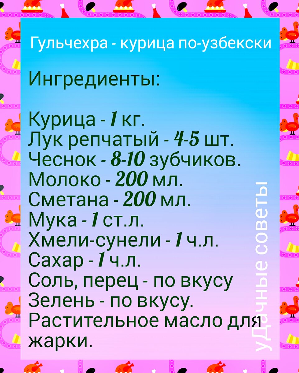 Не знаете, как приготовить курицу? Приготовьте гульчехру - курицу по-узбекски. Нежный сливочный вкус тающей во рту курицы запомнится всем домашним и вас попросят приготовить её ещё не один раз. К тому же готовится она очень просто. Итак, курицу (или её мясные части) режем на куски, освобождая от кожи. Лук режем полукольцами. Чеснок измельчаем ножом или пропускаем через пресс. Сначала обжариваем лук до хорошего золотисто-коричневатого цвета. Затем лук убираем, а в этом же масле обжариваем курицу до хорошей румяной поджарки. Возвращаем в сковороду лук. Вливаем молоко, выкладываем сметану, муку, солим, перчим, добавляем хмели-сунели, ложку сахара и измельченный чеснок. Тушим под плотно закрытой крышкой около получаса. Подаем блюдо чуть остывшим, обильно посыпав зеленью. Просто и неимоверно вкусно! Приятного аппетита! А если вы ищете рецепт простого и оригинального десерта - то на моём канале в более ранних публикациях вас ждут простые, вкусные и очень необычные рецепты. И