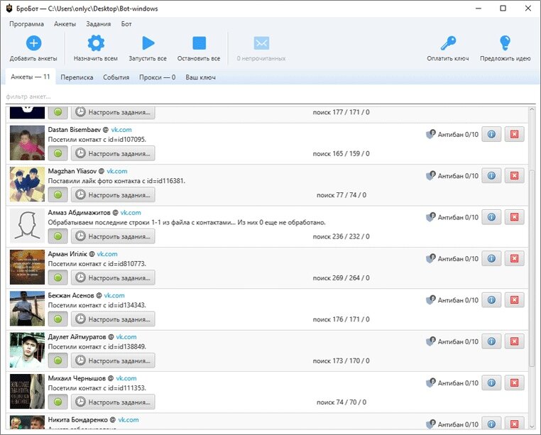 У программы BroBot простой и понятный интерфейс, в котором вы сможете быстро разобраться и приступить к работе. Также в программу встроен браузер, который позволит следить за работой ваших аккаунтов и быстро выявить неполадки, если с ними что - то случится. БроБот работает в многопоточном режиме, а значит возможен параллельный запуск и работа сразу нескольких аккаунтов. Однако, для корректной работы потребуется использование прокси.