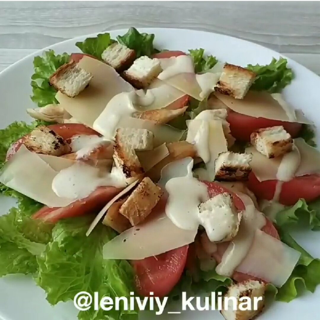 Осталось красиво выложить салат: листья салата, куриное филе, помидорки, сыр, сухарики. И СОУС. Побольше соуса.