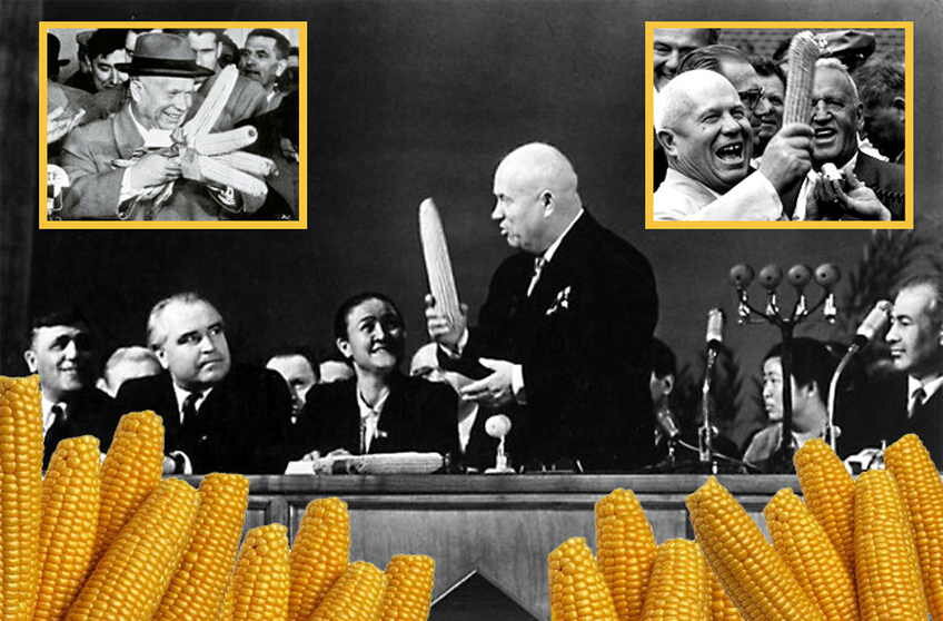 Никита Сергеевич Хрущев очень любил догонять и перегонять США. Как узнает, что в Штатах чего-то больше производят, так и давай сразу указания раздавать, чтобы в двадцать четыре часа обогнали и перегнали всех и доложили вышестоящему начальству о выполнении задачи. И как-то раз приехал он в Америку с визитом. Ну, почетного гостя приняли, как полагается. Банька там, девочки, вискарик рекой, лимоны с сахаром вагонами… А на закуску повезли его по полям, показать, как трудятся простые американские фермеры на ниве выращивания важнейшей сельскохозяйственной культуры – кукурузы. Никита Сергеич все внимательно посмотрел, про урожайность спросил, осведомился о применении и под конец поинтересовался валовым сбором, а когда общую цифру узнал, то еле глаза в орбитах удержал. До такой степени урожайным злак оказался. По возвращении домой как принялся Хрущев кричать и команды раздавать. В двадцать четыре часа! Засеять кукурузой все поля до полярного круга! Догоним и перегоним Америку по производству к