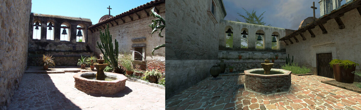 Сан-Хуан-Капистрано, которая расположена в городе Сан-Хуан-Капистрано, округ Ориндж, Южная Калифорния. Вот несколько фотографий из реальной жизни и cs go. T-spawn CT-spawn Точка B 2) Карта Dust 2 Следующая карта - это de_dust 2, наверное самая популярная карта за всю серию игр counter strike. До конца не известно была ли это место до создание карты или уже фанаты воссоздали её. Но факт остаётся фактом, так что смотрим. Выход на точку B T-spawn Шорт Яма Лестница 3) Карта Italy Последняя карта - это de_italy
