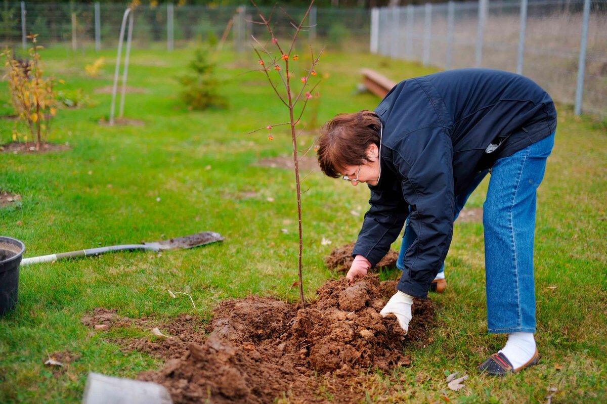 К посадке фруктовых деревьев стоит подойти ответственно. Сажать плодовые деревья желательно весной. Если погода теплая и солнечная, саженцы приживаются хорошо. К осени они успевают укрепиться, накопить большое количество полезных веществ. Весной посадку необходимо осуществлять в апреле. Ямы необходимо подготовить еще осенью. Это даст возможность посадить саженцы, не дожидаясь, когда земля просохнет от снега. Кроме этого, в яме за зиму накопится большое количество влаги. Посадка саженцев Для начала необходимо выкопать яму и в ее середину забить деревянный кол длиной 2 метра. После в яму нужно насыпать удобрения. Для этого стоит взять 3 ведра помета и 3 кг суперфосфата. Перемешать все с землей и засыпать в яму. Сверху стоит еще насыпать немного земли и уплотнить ее ногами. Затем вставить саженец и сделать лунку для удобного полива. Чтобы земля возле корней не бралась кусками, саженец необходимо хорошо встряхнуть, аккуратно приподнимая за ствол. Саженец должен быть посажен таким образом,