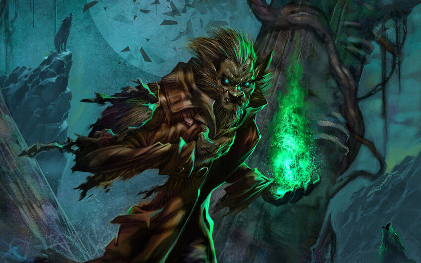 Купец, бледный, как мел, пятится к лошадям, не спуская с волкулака перепуганного взгляда. От телег заорали наёмники, донёсся злой лай и вопли боли. Волки перепрыгивают телеги, заполняют поляну, не спеша окружая купцов. Незнакомец рывком сорвал одежду, обнажая покрытый шерстью торс, с деформированными конечностями, больше похожими на лапы. Вместо лица волчья морда, с длинными, как кинжалы клыками.
