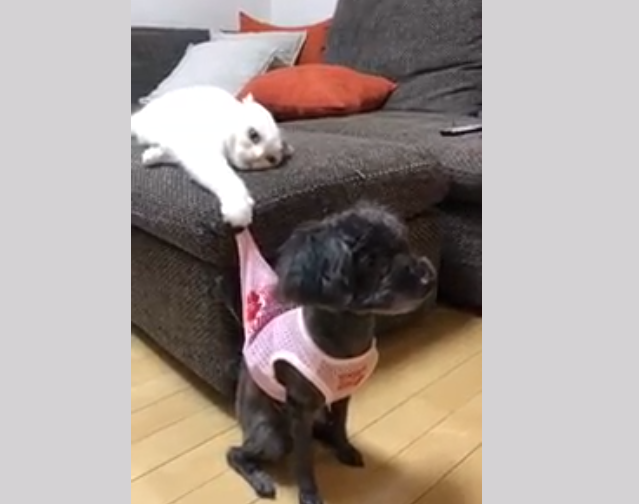 Жительнице японского Китакюсю – города на острове Кюсю удалось отснять забавное соревнование между своими домашними любимцами в середине октября. Победила её белая суперкошка, померившись силами с маленькой собачкой. Одной лапой, лёжа на диване, она подцепила когтями край одежды пёсика. И сколько бы собачонка ни рвалась убежать, все её попытки удалиться от дивана были пресечены сильной когтистой лапой. Кошка удерживала собачку, словно на привязи. И на свободу не отпускала, пока ей самой не надоела эта игра. Посмотреть видео