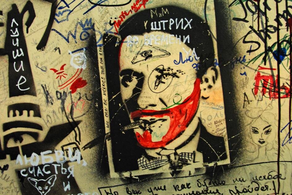 Здесь же более не буду мучить вас лишними словами, просто смотрите фото ниже – там всё, что мы увидели в самой квартире №50 и (возможно это даже интереснее и важнее) – пока к ней поднимались, на стенах вдоль лестницы. Их, говорят, поклонники творчества Михаила Афанасьевича, давно вычислившие подлинный адрес «нехорошей квартиры», начали расписывать своими автографами еще в далекие советские времена…