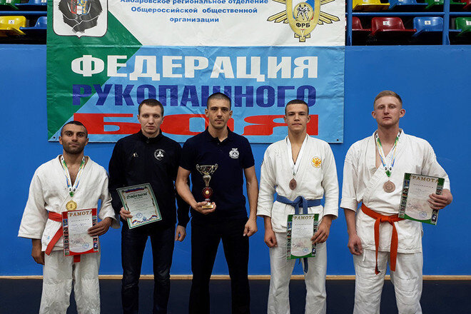В Хабаровске состоялись соревнования по рукопашному бою, посвященные 80-летию со дня образования Хабаровского края. На состязаниях удачно выступили спортсмены из Амурской области. Команда стала бронзовым призером чемпионата ДФО. Всего в соревнованиях принимали участие более 100 спортсменов из Хабаровского и Приморского краев, Еврейской автономной области, Амурской области и Якутии, а также представители различных силовых ведомств. Высокий уровень и профессионализм в упорнейших поединках показали спортсмены амурской команды, которая по итогам заняла третье место. В личном зачете заняли третьи места: в весе до 65 килограммов – Сергей Сафонов, в весе до 75 килограммов – Данил Чебанюк. Чемпионом в весовой категории до 55 килограммов стал Андраник Абаджян. Все спортсмены учатся в ДВОКУ. Победители и призеры вошли в сборную команду Дальневосточного федерального округа. В начале декабря они поедут на чемпионат России, который пройдет в Красноярске, сообщает министерство по развитию физкульту