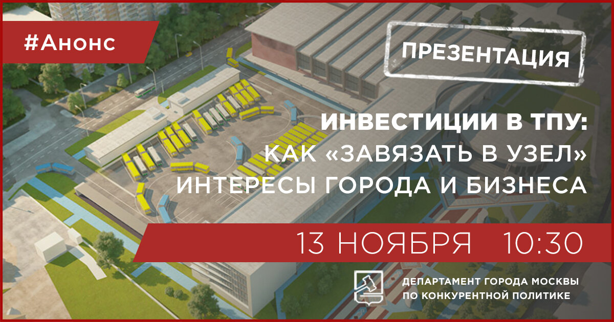 Презентация «Инвестиции в ТПУ «Новокосино» и «Алма-Атинская»: знаковые проекты для города и бизнеса» пройдет в Москве 13 ноября. На мероприятии будут представлены инвестиционные проекты транспортно-пересадочных узлов «Новокосино» и «Алма-Атинская», выставленные на аукционы со снижением стоимости на 30 процентов. Победители торгов получат возможность реализовать крупные девелоперские проекты в границах будущих ТПУ. Об особенностях проектов, их технико-экономических характеристиках расскажут представители органов исполнительной власти Москвы и АО «Мосинжпроект». Оценку проектам дадут представители консалтинговых и девелоперских компаний, представители общественных организаций. Презентация состоится по адресу: Кутузовский проспект, д. 2/1, стр.1 (гостиница «Radisson Украина», зал «Библиотека») Начало в 10:30. Мероприятие бесплатное, регистрация доступна по ссылке. Организатор мероприятия - Департамент Москвы по конкурентной политике.
