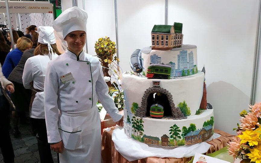 Студенты ІІІ курса Барановичского технологического колледжа Белкоопсоюза Иван Ходаковский и Вероника Чиркун представили свои авторские работы на Международном чемпионате кондитерского искусства. Парень завоевал золотую медаль в номинации «Праздничный торт на тему «Моя малая родина», а девушка удостоена серебра в номинации «Художественная работа из овощей и фруктов». – Ребята сами придумали идеи для своих работ и самостоятельно выполнили все элементы, – рассказала руководитель практики Барановичского технологического колледжа Белкоопсоюза Наталья Орловская. По словам Натальи, Иван очень интересуется своим генеалогическим древом – его предки тесно были связаны с железной дорогой. Отсюда и идея для работы – трехъярусного торта, на котором представлена история становления города Барановичи: «Цягнік з мінулага ў сучаснае». – На первом ярусе пищевыми красками изображен дом Развадовских, на втором – старинные часы и туннель, в который въезжает старинный поезд, а уже на третьем ярусе – вые