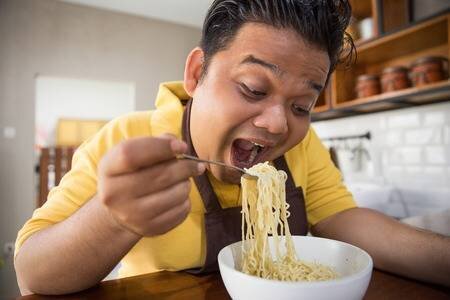 практически готовый продукт "Доширак" , далее вскрываем упаковку , внутри лежат пакетики , рвем их зубами и высыпаем содержимое на лапшу , при этом нужно постараться распределить все приправы-отравы пропорционально. Внимание!!!! саму лапшу не вынимаем из емкости и не выкидываем крышку она пригодиться нам еще..