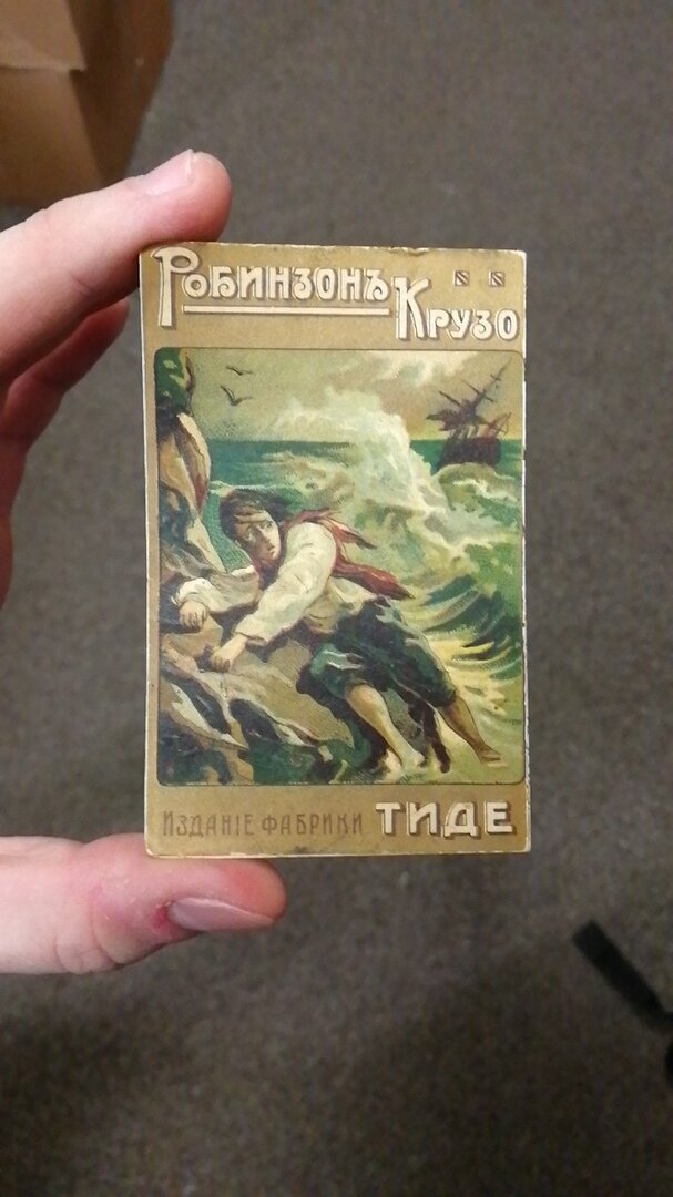 Сначала я подумал, что это просто миниатюрное издание, но все оказалось чуть интереснее. Оказалось, что это раскладной рекламный буклет. Крайне примечательный пример книжной рекламы самого конца XIX - начала ХХ веков. Относительно небольшая "Фабрика шоколада, конфет, какао и кофе Л. Ф. Тиде" действовала в Москве с 1868 года. У них было собственное здание на Генеральной улице (ныне Электрозаводская). По всей видимости, этот вкладыш либо рекламировал некое издание знаменитого, произведения Д. Дефо, либо литографскую мастерскую, которая может похвастать качеством печати, либо же это был некий презент от самой конфетно-шоколадной фабрики.