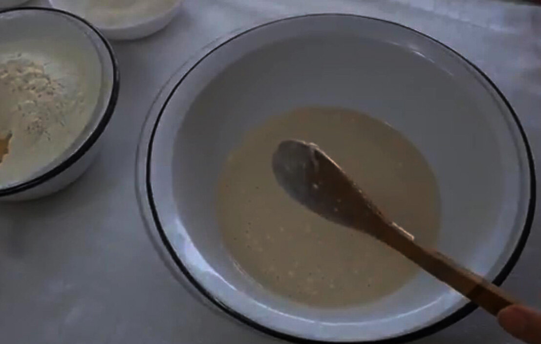 1. Первым делом приготовим опару. Ссыпаем в глубокую ёмкость дрожжи, добавляем туда ложку сахара, вливаем тёплое молоко(35-38 градусов) и все это хорошо перемешиваем. Добавляем 4 столовые ложки муки(просеянной) и перемешиваем до однородности. Опара готова! Накрываем её сухим полотенцем и ставим в тёплое место. Опара должна увеличиться в несколько раз. 2. В готовую опару добавляем яйца, цепочку соли, весь сахар и ванилин. Перемешиваем миксером на маленькой скорости или ложкой. Так же до однородности.