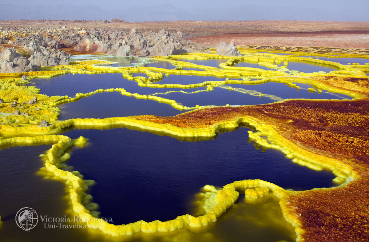 В отдаленном районе северо-востока Эфиопии находится самая низкая часть Африки - впадина Данакиль, с максимальными отметками до 100 метров ниже уровня моря. Здесь проходит тектонический разлом, который еще называют Великим Рифтовым Разломом Африки. Здесь же, самое большое скопление потухших и действующих вулканов. Огромные лавовые поля, разноцветные минеральные образования, самое доступное в Мире лавовое озеро - этого более чем достаточно, чтобы захотеть туда поехать и увидеть все это собственными глазами.