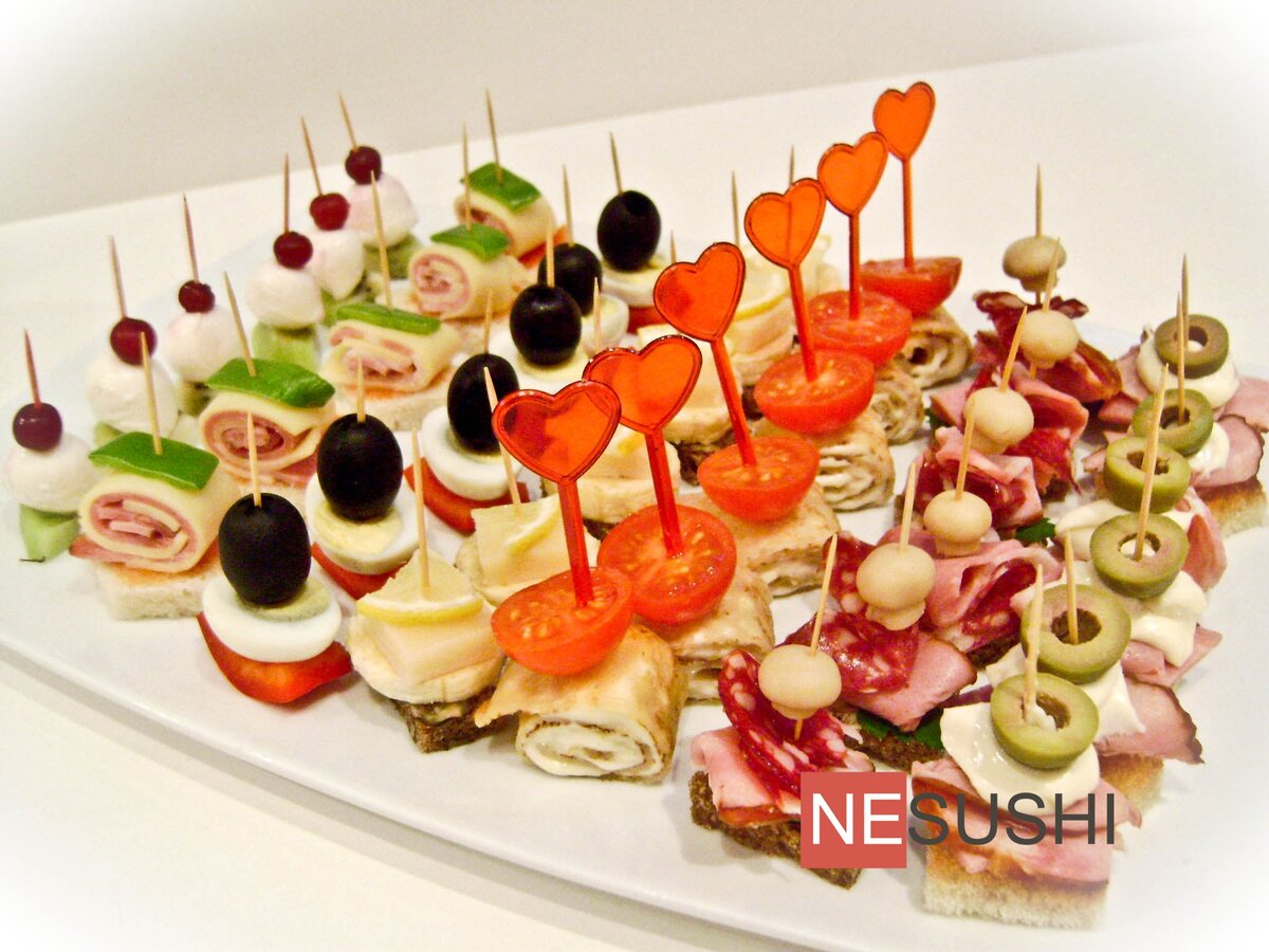 СОСИСКИ В СЛОЙКЕ 100 грамм слоеного теста 3 сосиски 1 столовая ложка мака 1. Сосиски отварите и порежьте каждую на 5 частей. 2. Тесто раскатайте в одном направлении.Обсыпьте маком. 3. Нарежьте тесто прямоугольниками. 4. Каждый кусочек сосиски обмотайте в тесто и выложите на смазанный маслом противень.Выпекайте 20 минут. ТРЕУГОЛКИ С КИЛЬКОЙ 3 кусочка белого хлеба 3 редиски 15 оливок фаршированных перцем 8 слабосоленых килек растительное масло 1. Хлеб порежьте на треугольники и обжарьте.Редиску порежьте на кружочки.Удалите у кильки голову,хвост,хребет.Разделите филе на две части.В каждую заверните по оливке. 2. Соберите канапе хлеб-редис-килька.Зафиксируйте зубочисткой или шпажкой. ПИРАМИДА С СЫРОМ 100 грамм твердого сыра 100 грамм вареной колбасы 100 грамм мягкого творожного сыра с укропом 1. Порежьте сыр и колбасу очень тонко. Вырежьте из них одинаковые фигуры. 2. Складывайте канапе следующим образом: сыр твердый,тонкий слой творожного сыра,колбаса,толстый слой творожного сыра, и даль