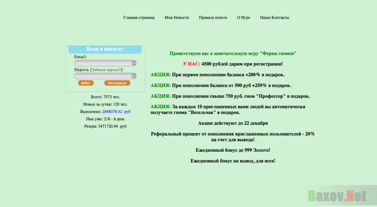 Данный сайт - очередной лохотрон, который предлагает заработок денег посредством приобретения гномов для ферм золота. Такие лохотроны активно работают в течении нескольких лет, и уже многие люди попались на крючок злоумышленников. Будьте бдительными и не дайте себя обмануть. Виртуальные гномы реальные деньги зарабатывают только для своих создателей. Для вас это только игра - так в Правилах написано. Вы читали их, когда регистрировались?